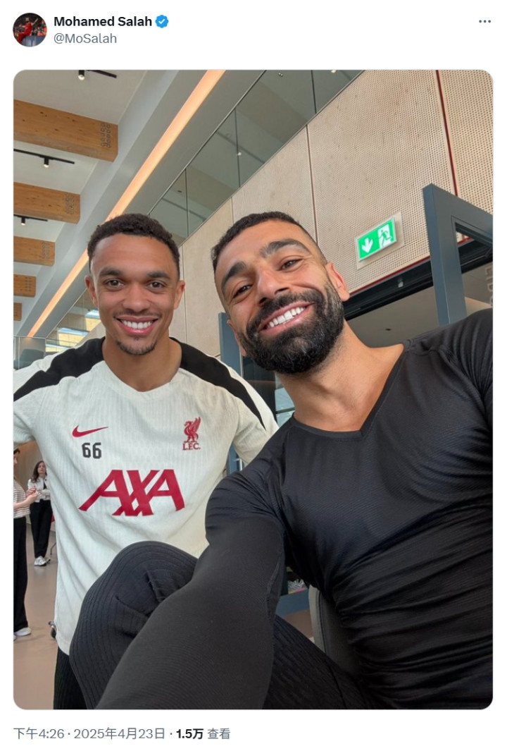直播吧04月23日讯利物浦球星萨拉赫刚刚在个人社交媒体晒出一张照片,是他和阿诺德在训练基地的合照。